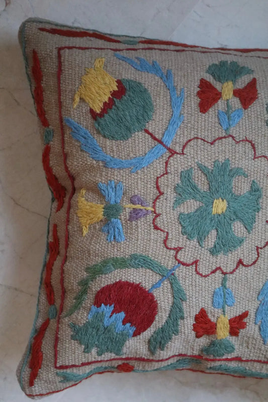 Coussin Suzani Fait-Main Gris Clair Motifs Brodés Colorés