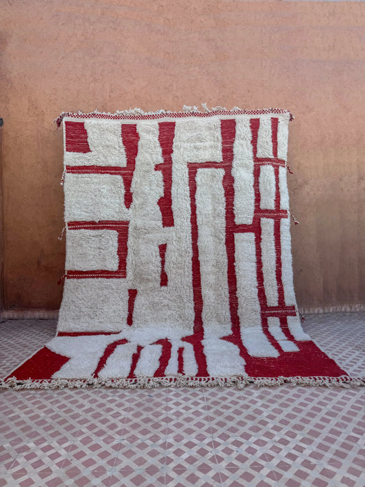 Tapis Berbère Béni Ouarain Moderne Blanc Motifs Rouges - 160 x 115 cm