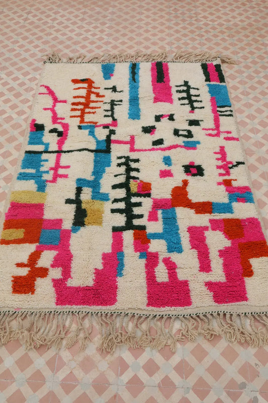 Tapis Berbère Coloré Azilal Blanc à Motifs Multicolore- 152 x 106 cm