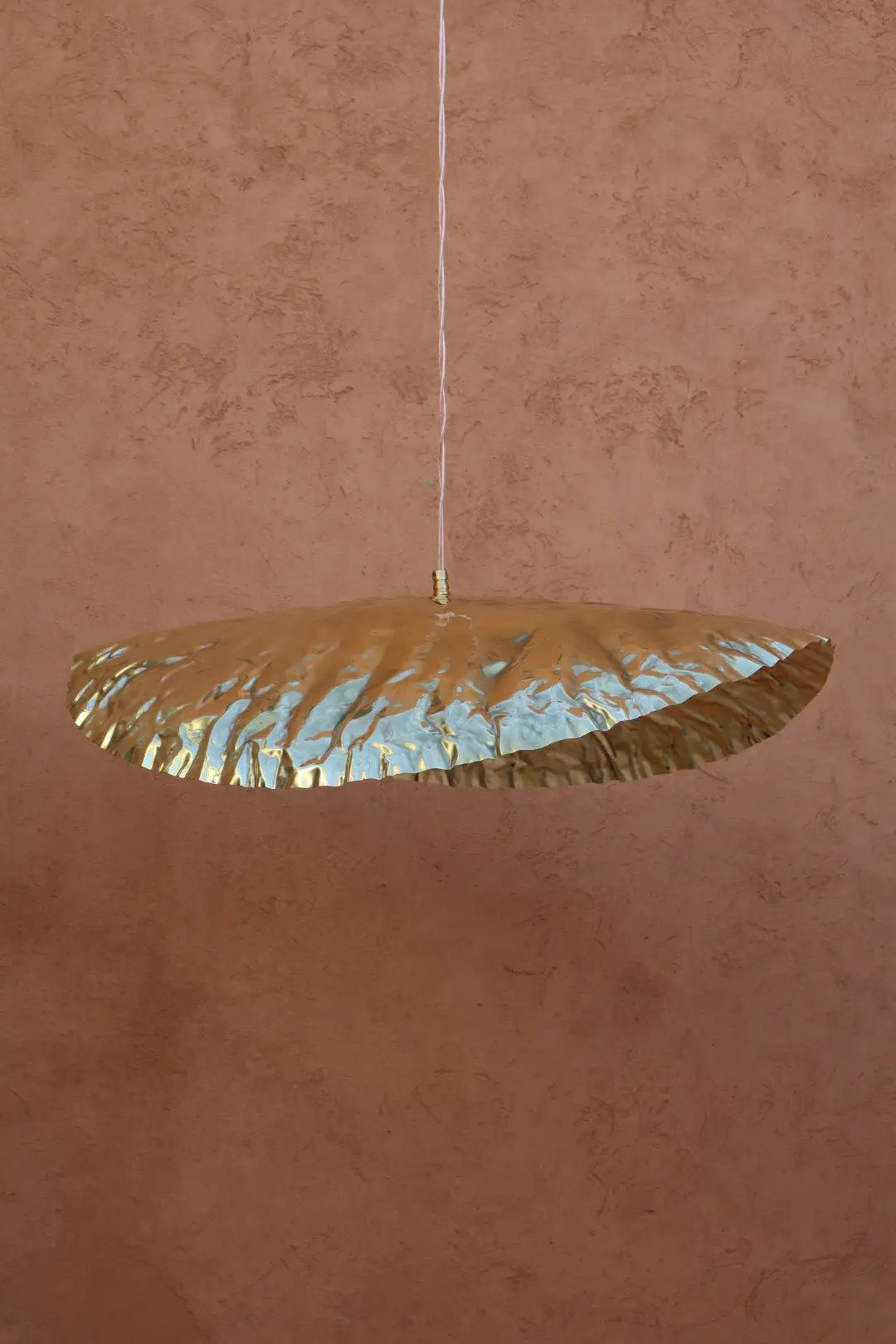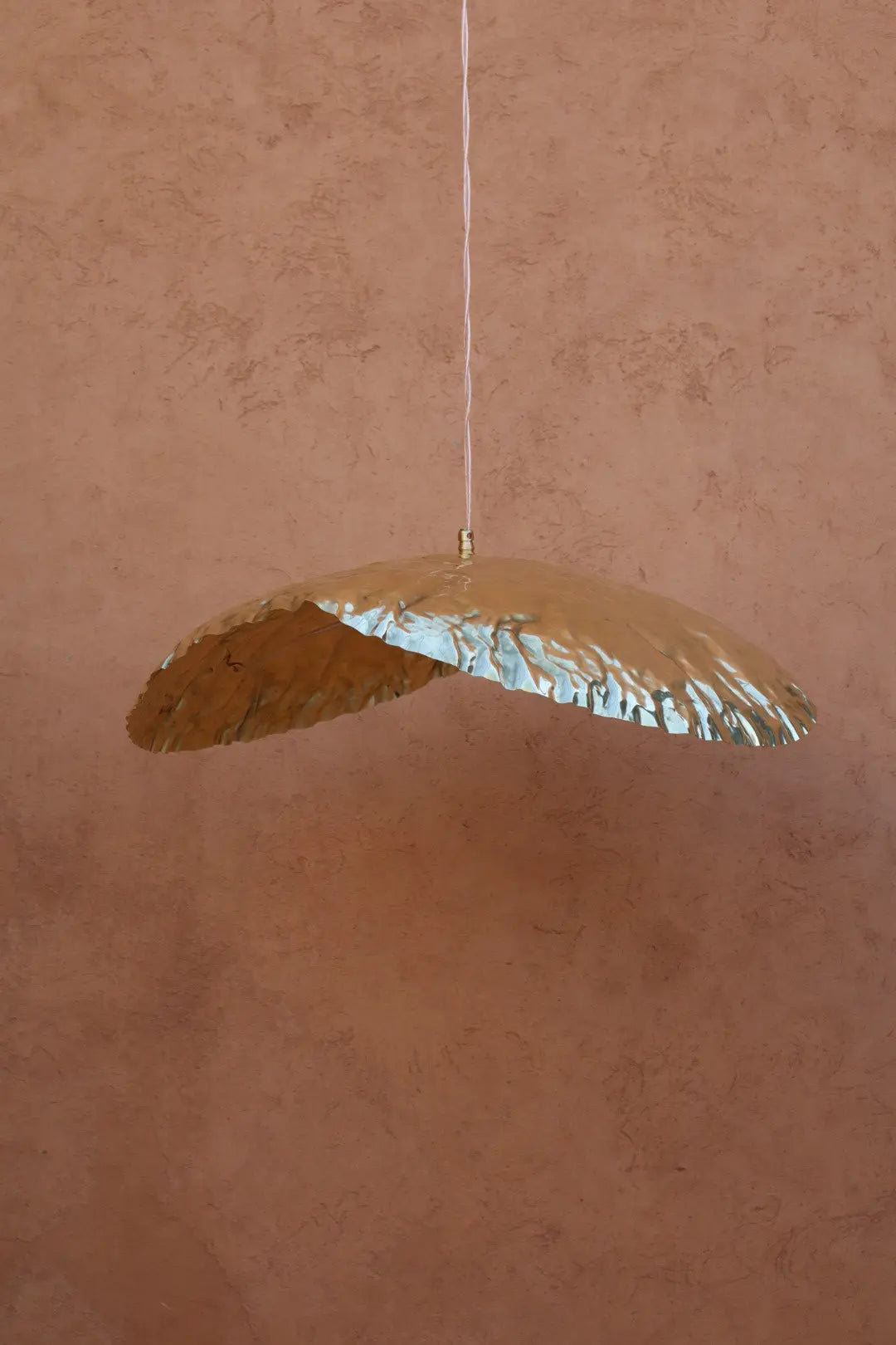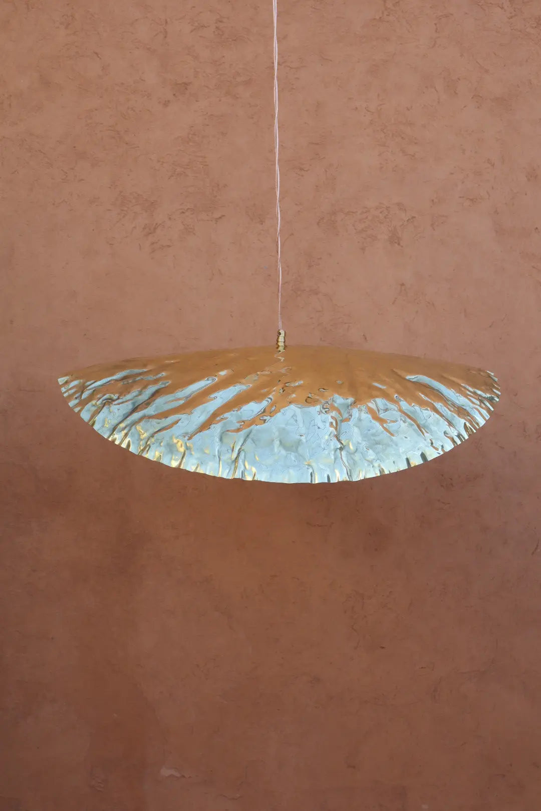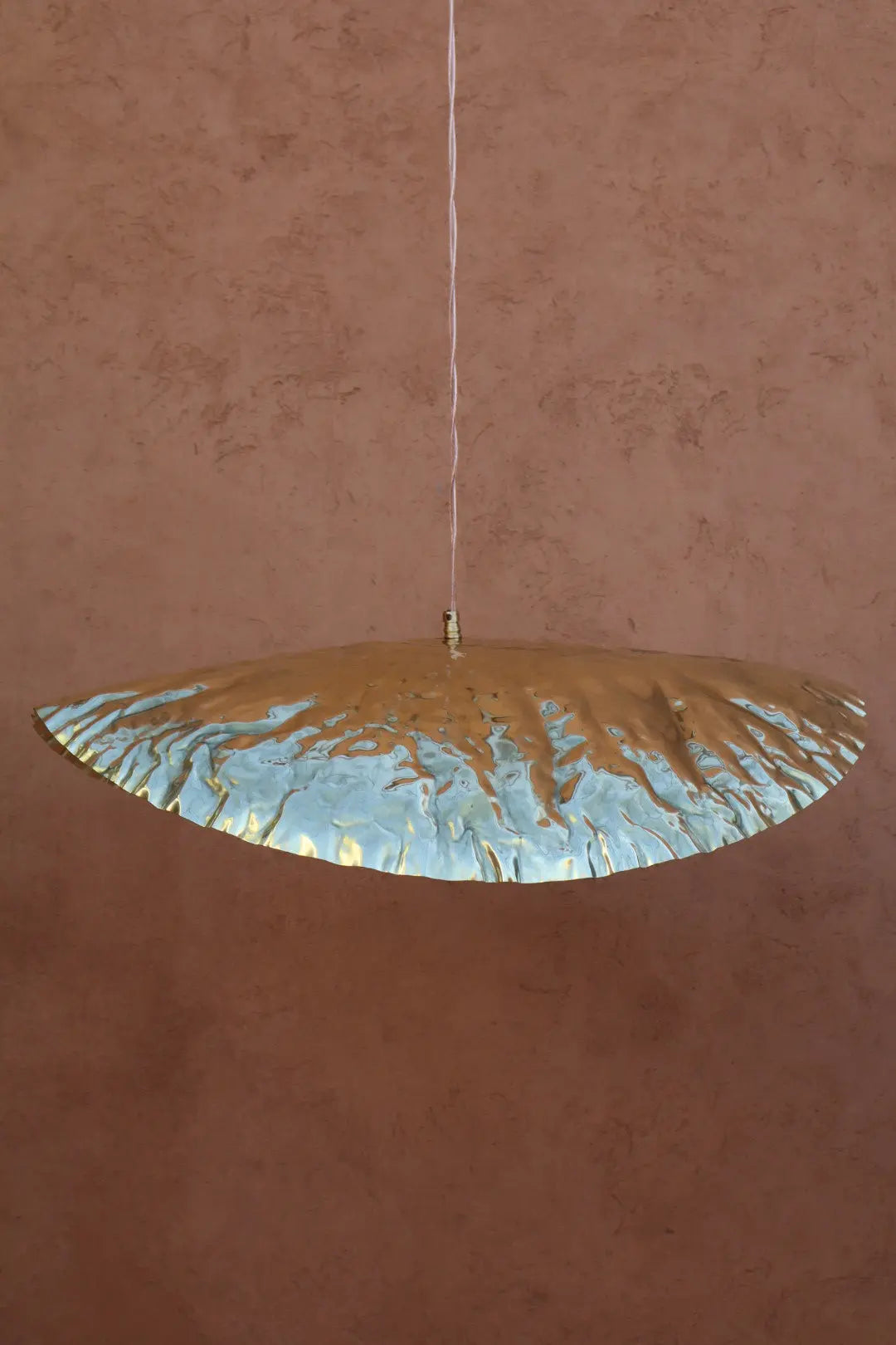 Hängeleuchte aus krakeliertem, gehämmertem, vergoldetem Messing in Form eines Blattes mit harmonischen Kurven.