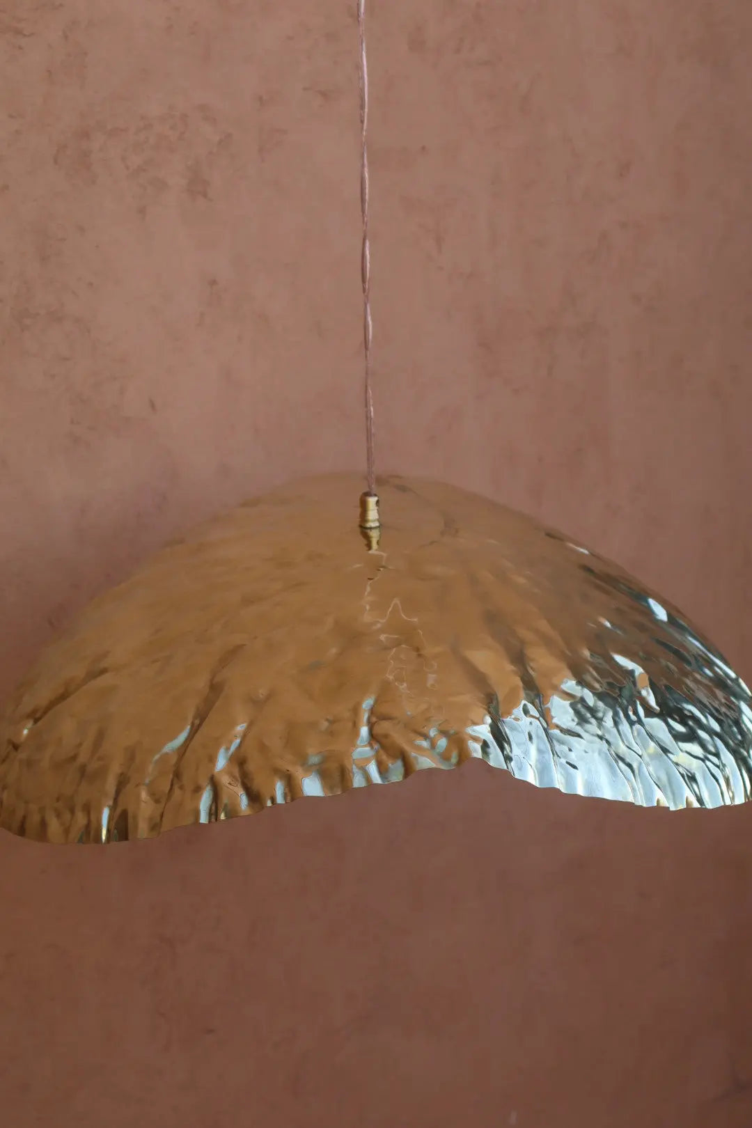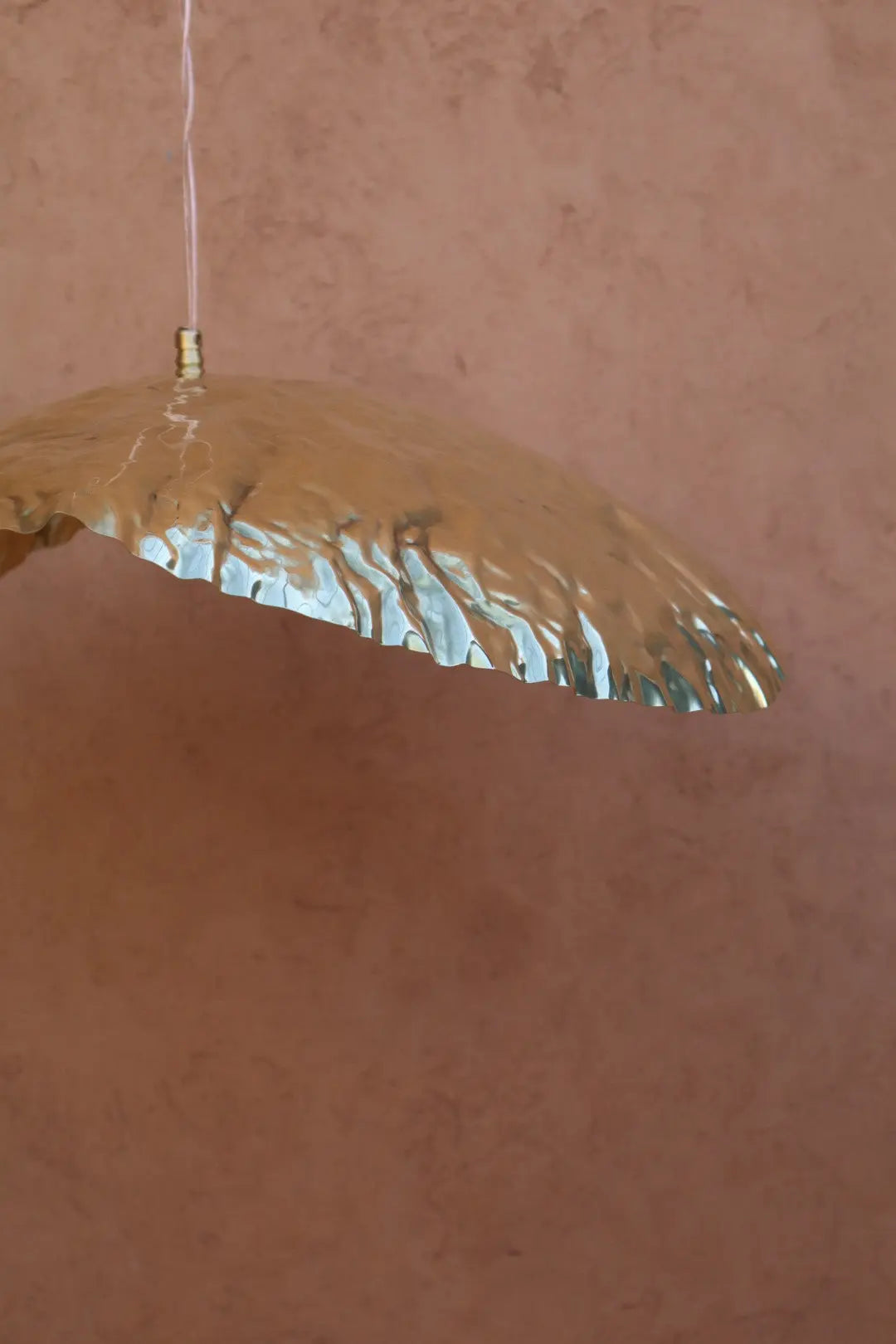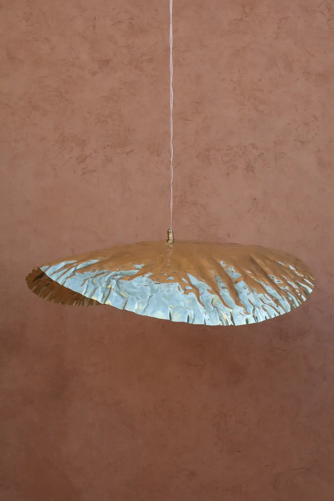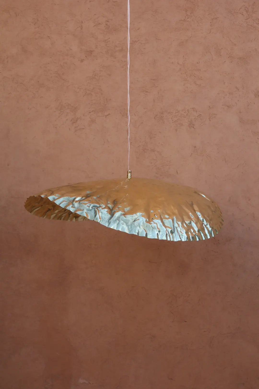 Hängeleuchte aus krakeliertem, gehämmertem, vergoldetem Messing in Form eines Blattes mit harmonischen Kurven.