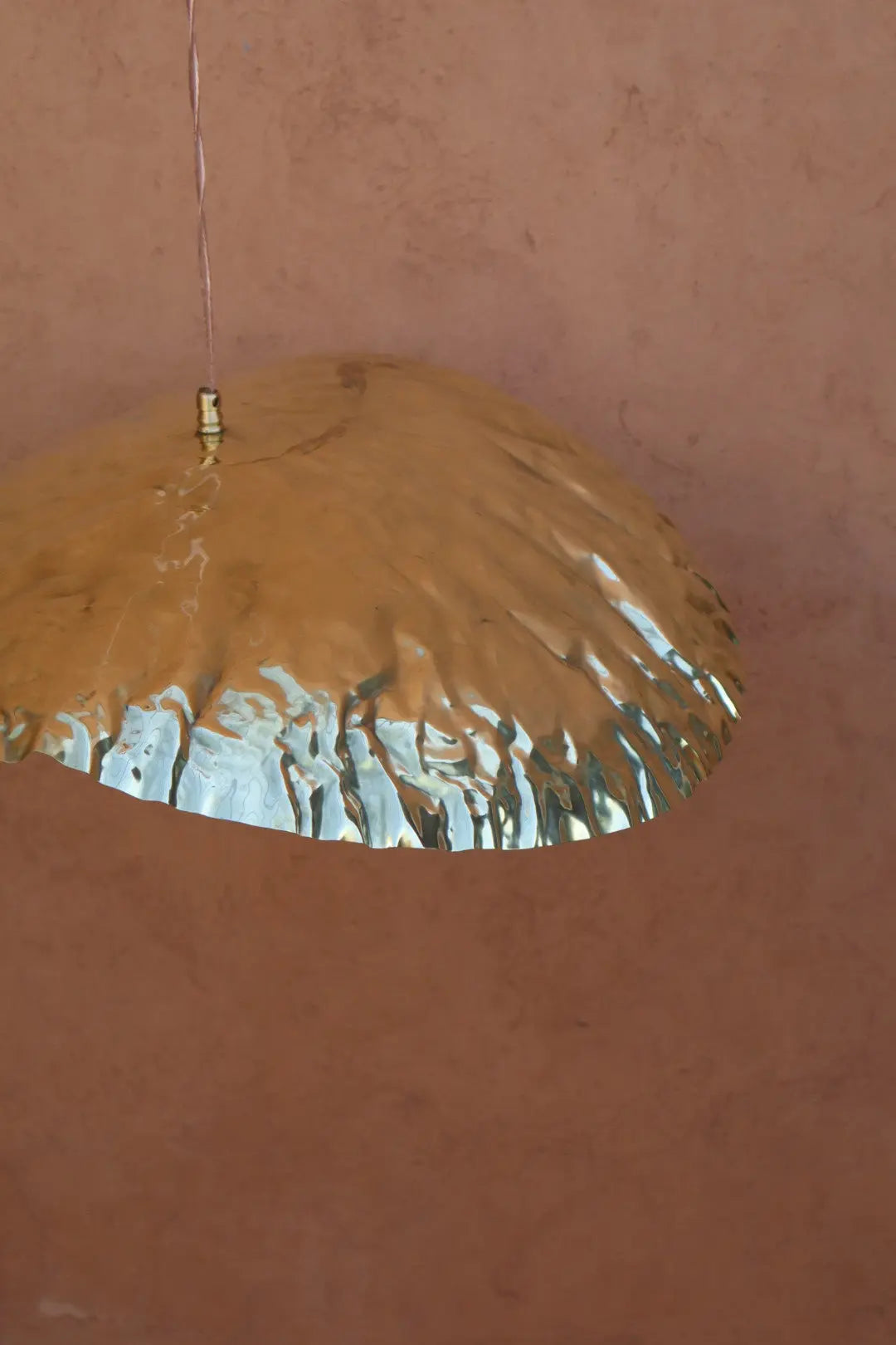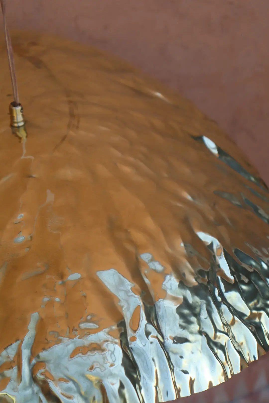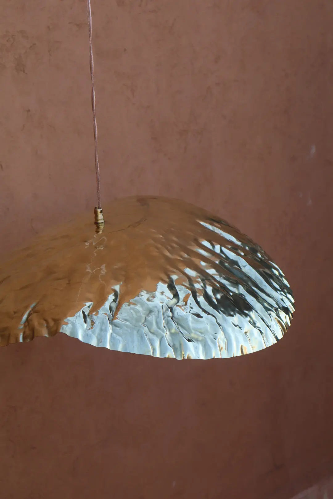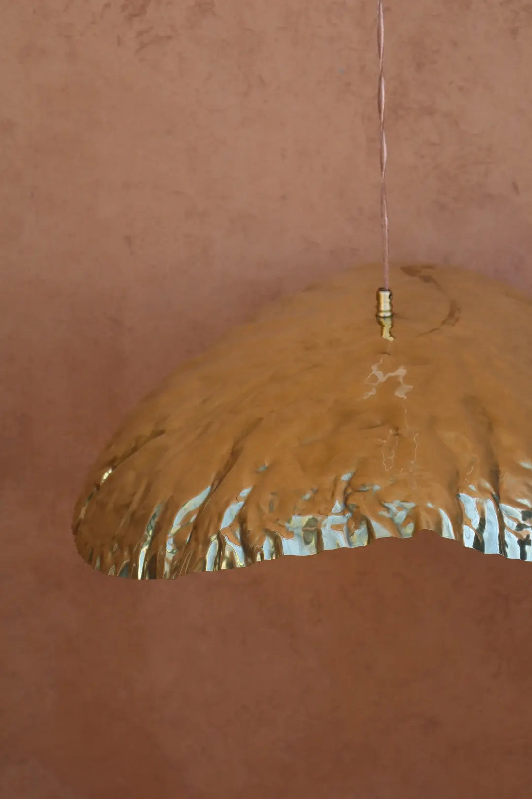 Hängeleuchte aus krakeliertem, gehämmertem, vergoldetem Messing in Form eines Blattes mit harmonischen Kurven.