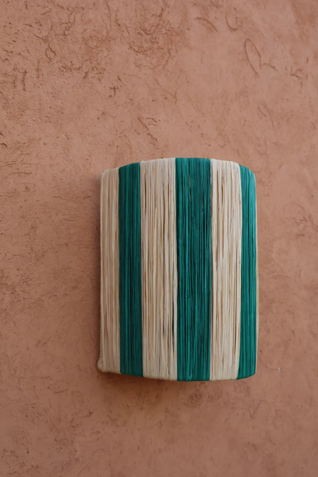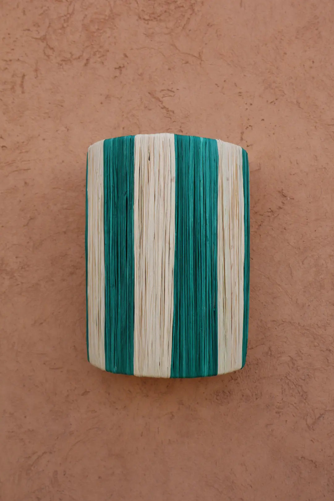 Wandleuchte aus gestreiftem Raphia in Tannengrün und Natur