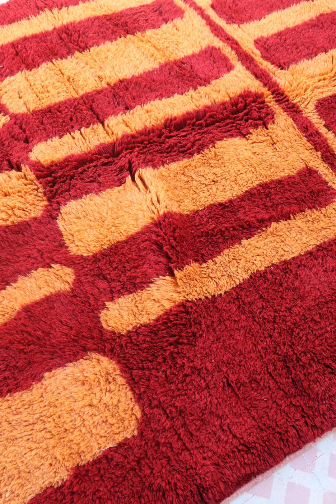 I imagined this rug as a tribute to the free forms and bold colors of the 70s. A deep cherry red mixed with a solar orange, for a retro and enveloping atmosphere.