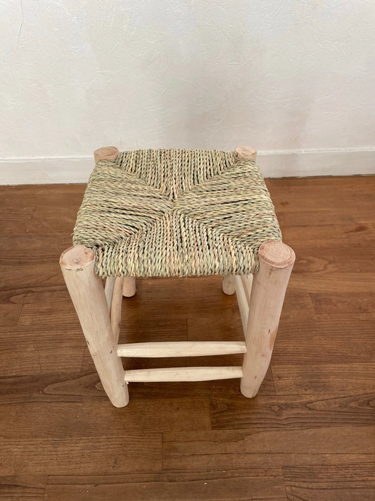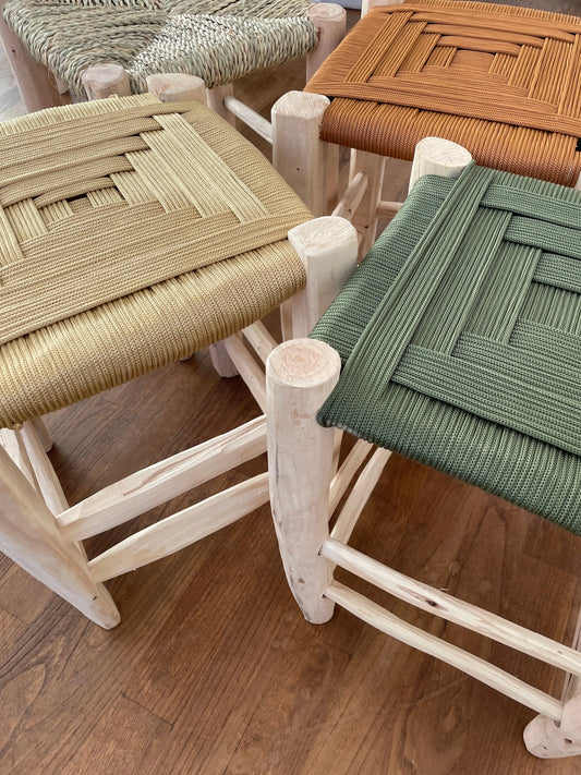 Taburetes marroquíes de madera berber con un colorido asiento de nylon